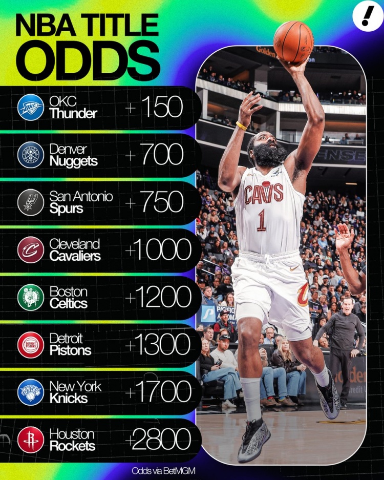 Kaiyun Sports-开云体育-夺冠赔率:雷霆+150第1 掘金2&马刺3 骑士+1000第4 火箭+2800第8